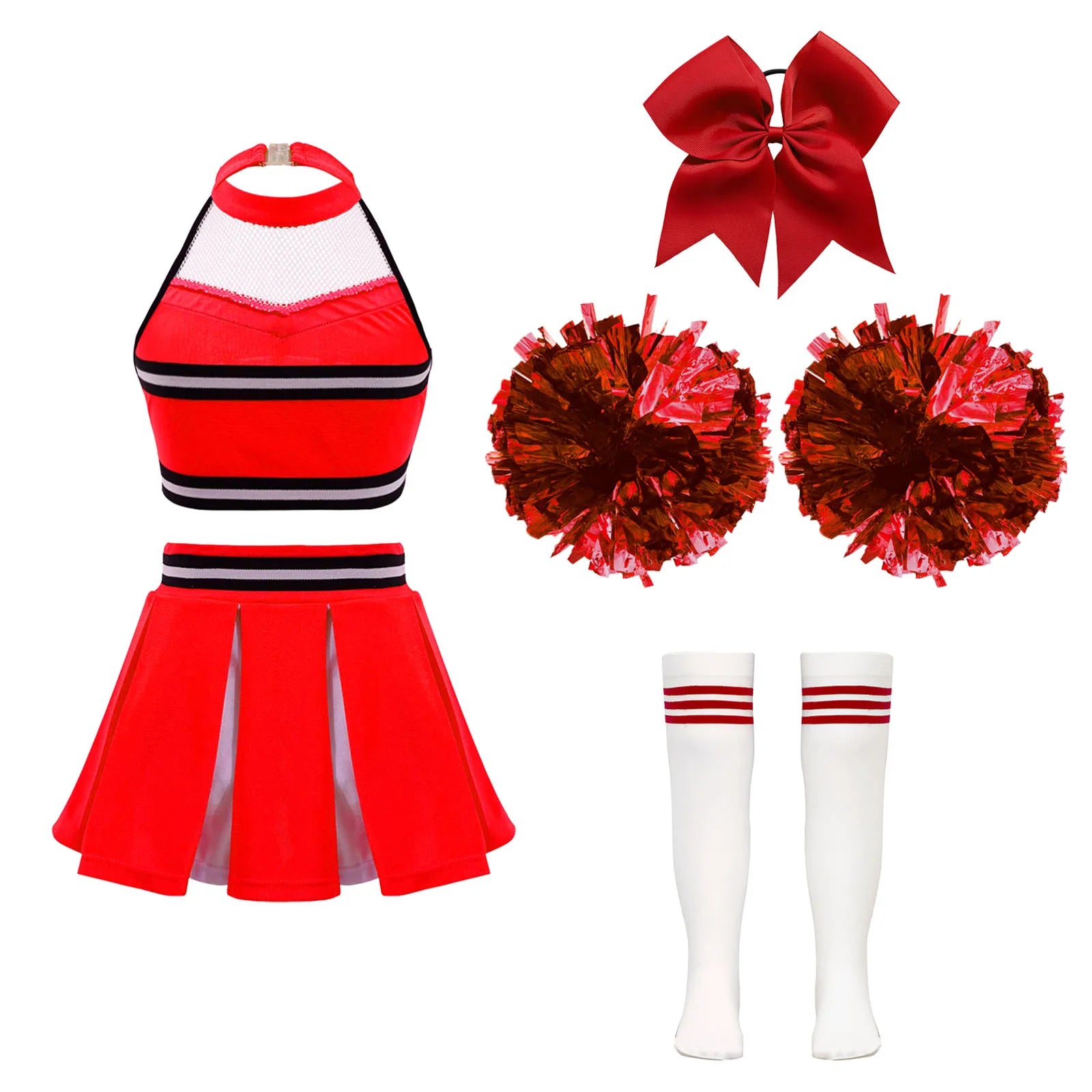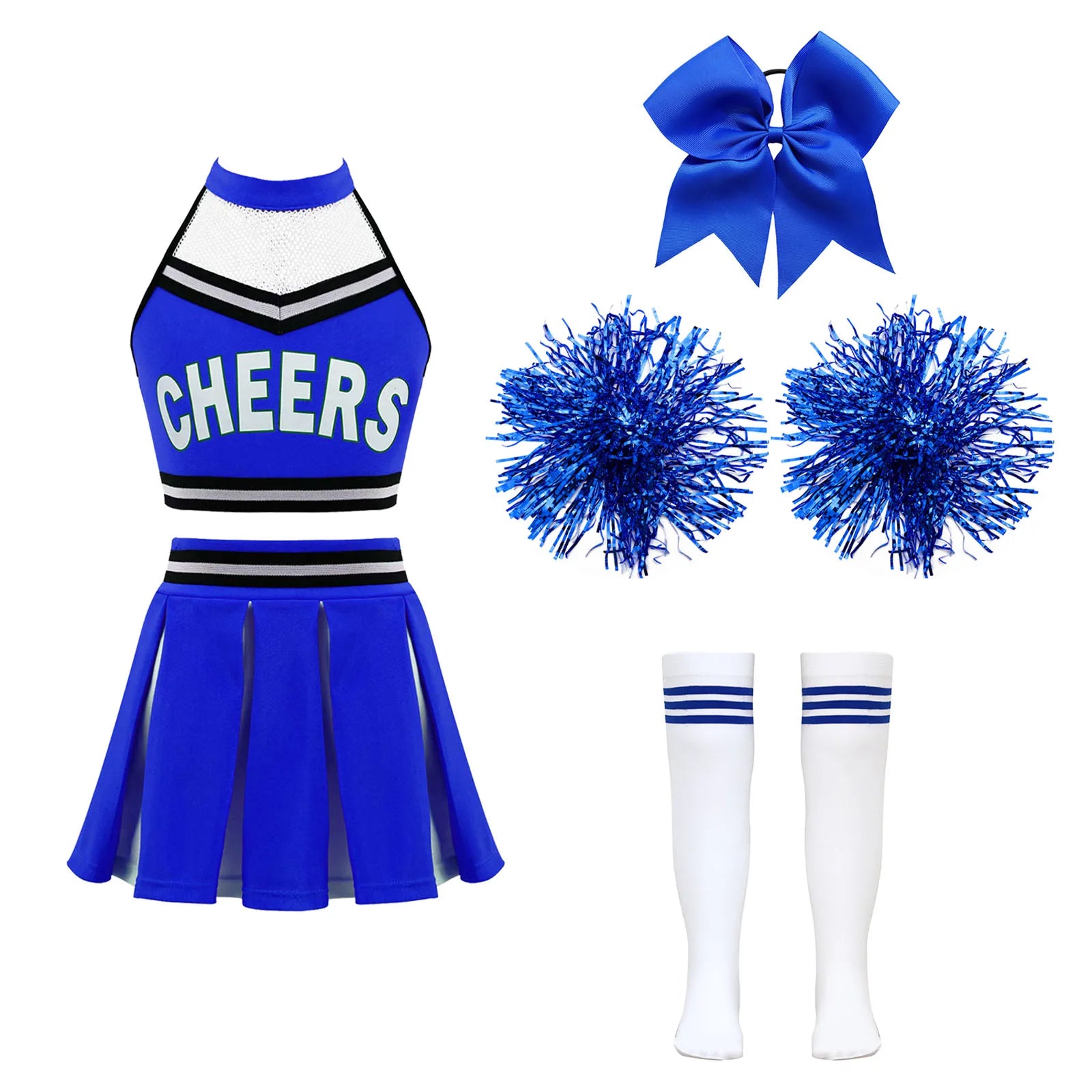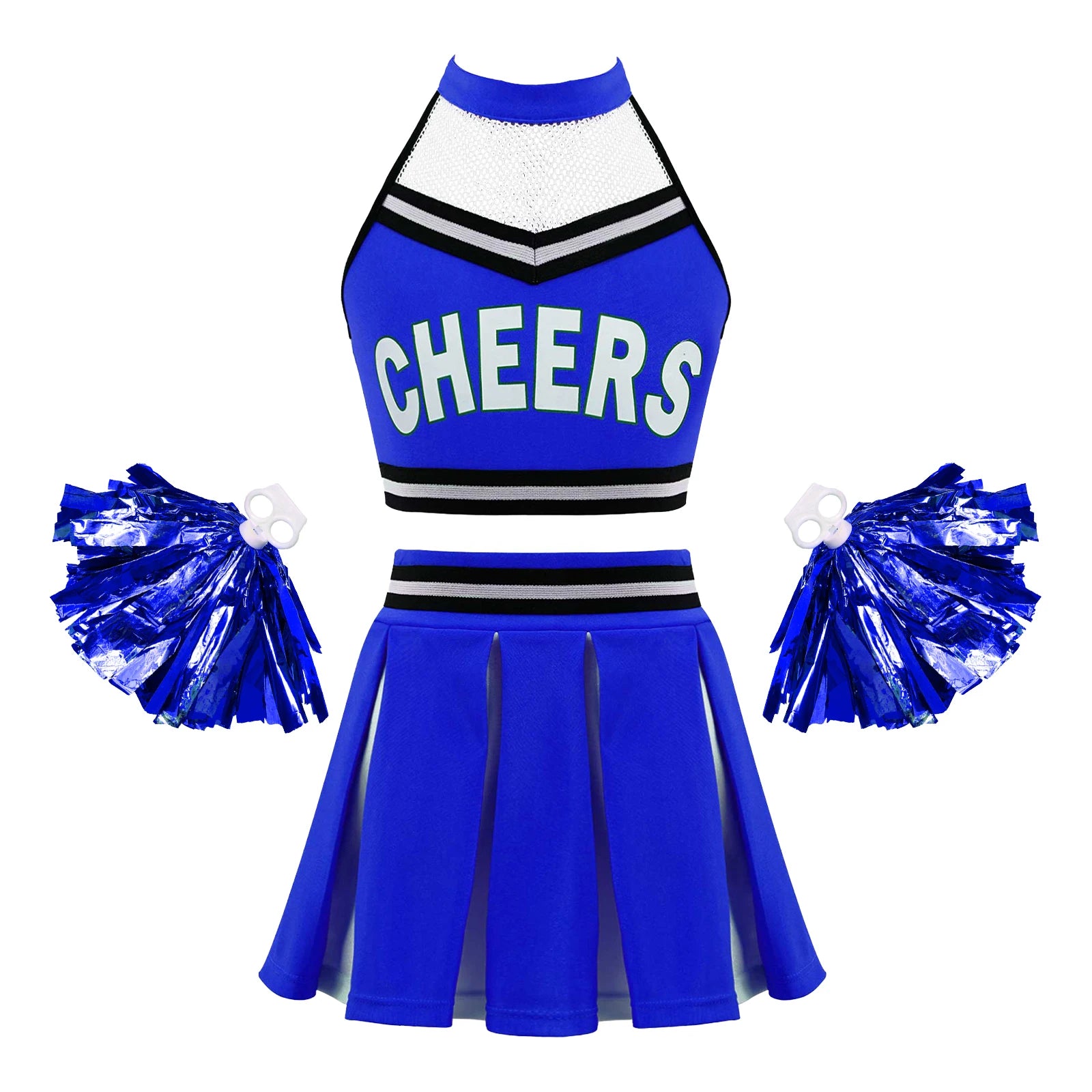 Girls Cheerleader Uniform Dance Costume Halter Mesh Patchwork Cheers Print Crop Top with Pleated Skirt Pompoms Cheerleading Suit