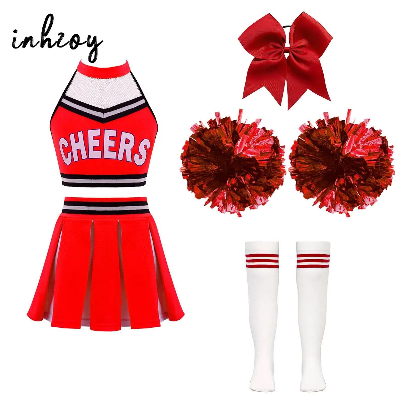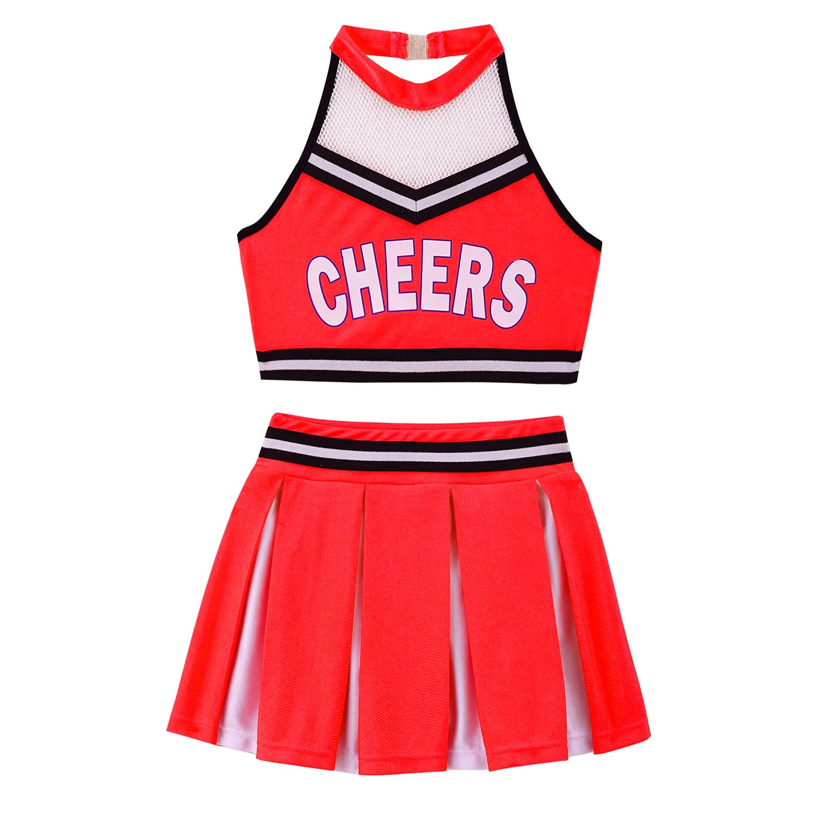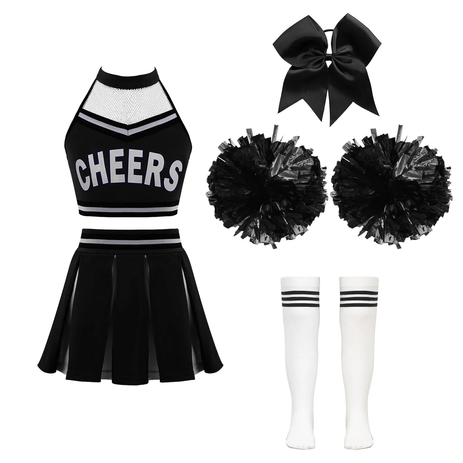 Girls Cheerleader Uniform Dance Costume Halter Mesh Patchwork Cheers Print Crop Top with Pleated Skirt Pompoms Cheerleading Suit