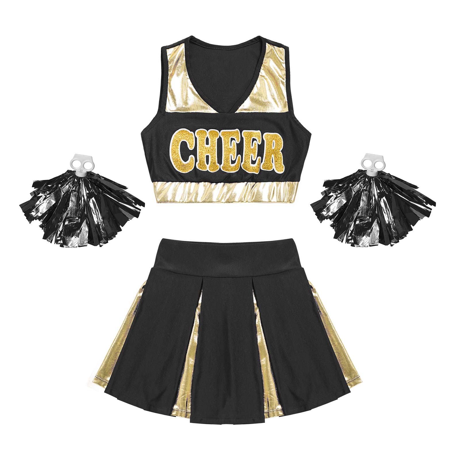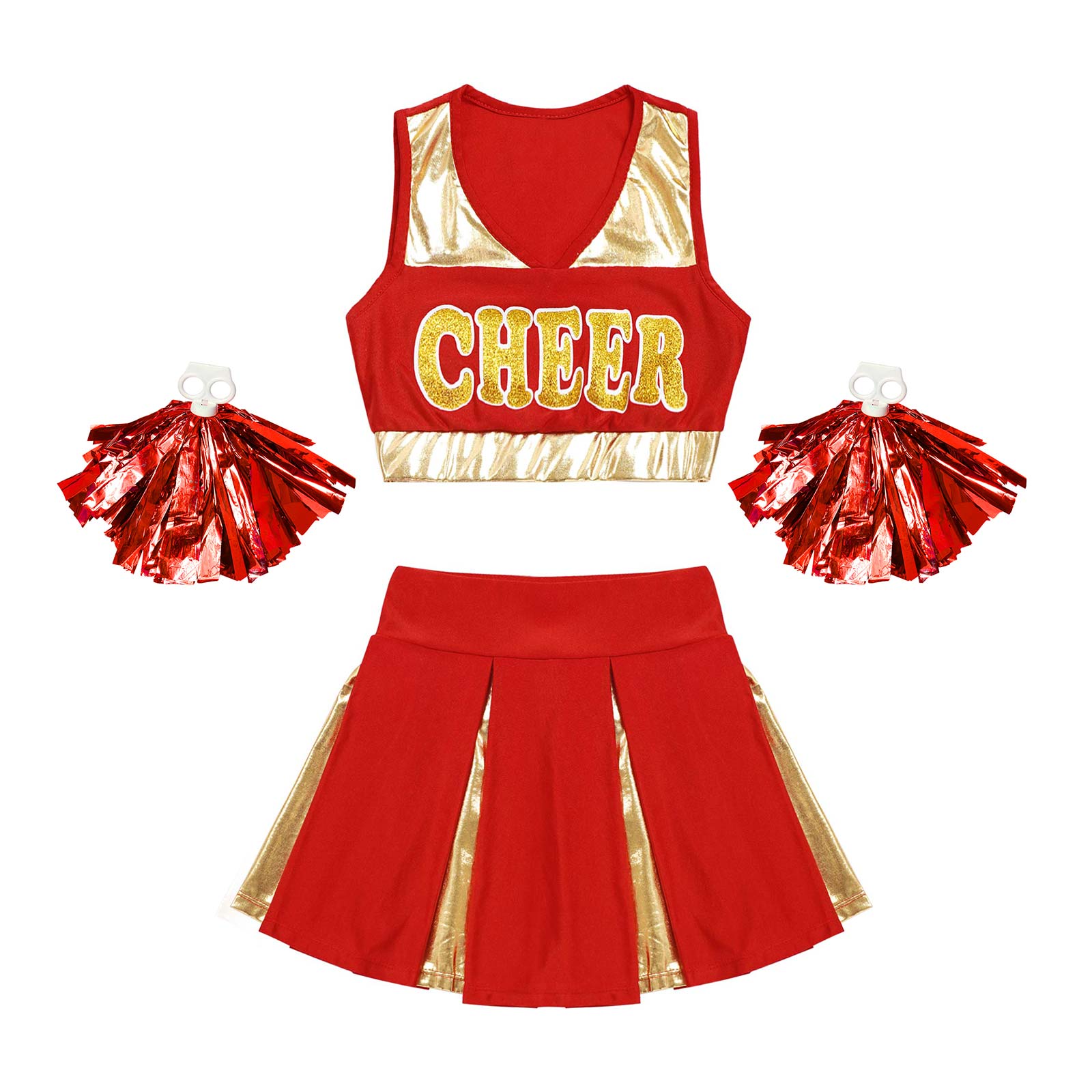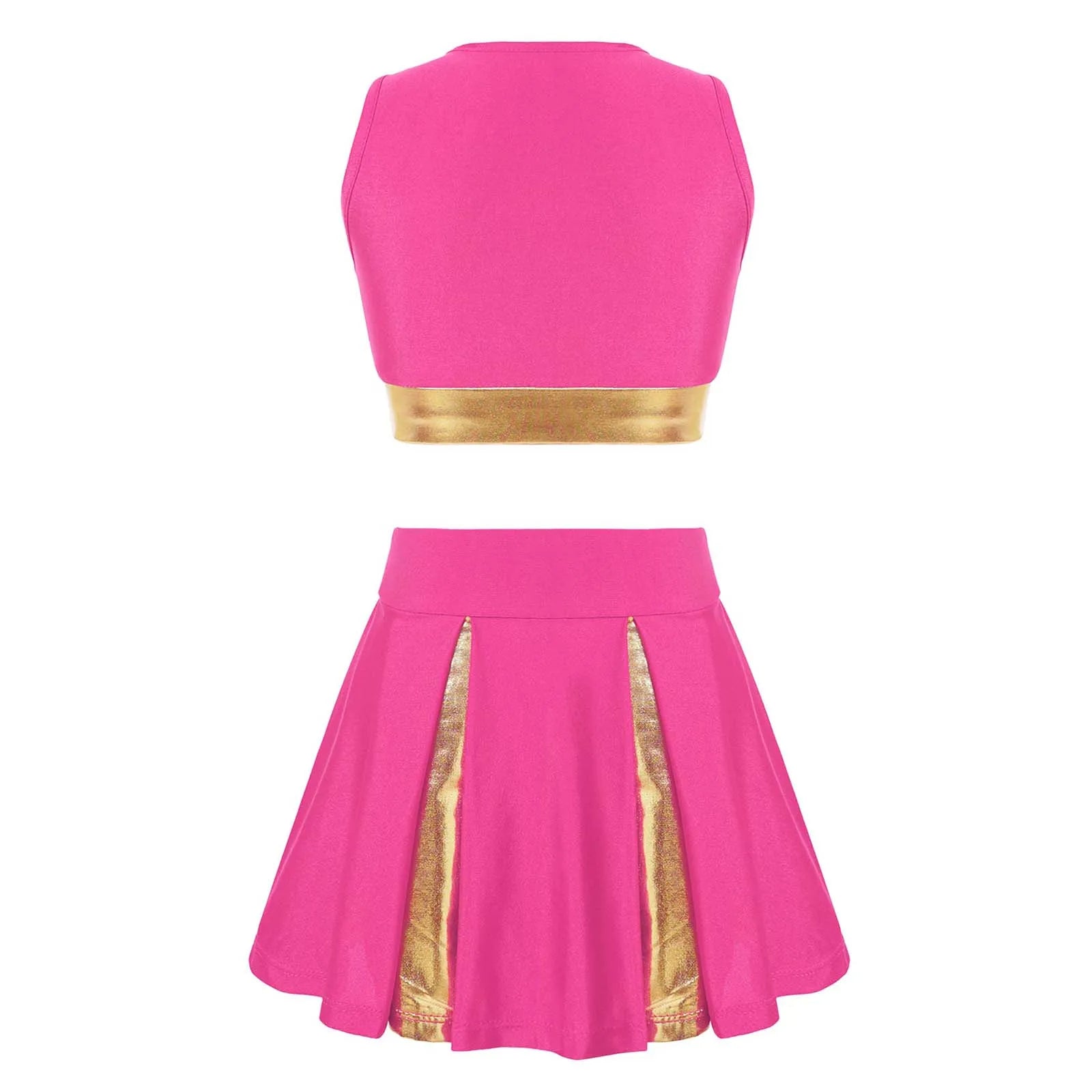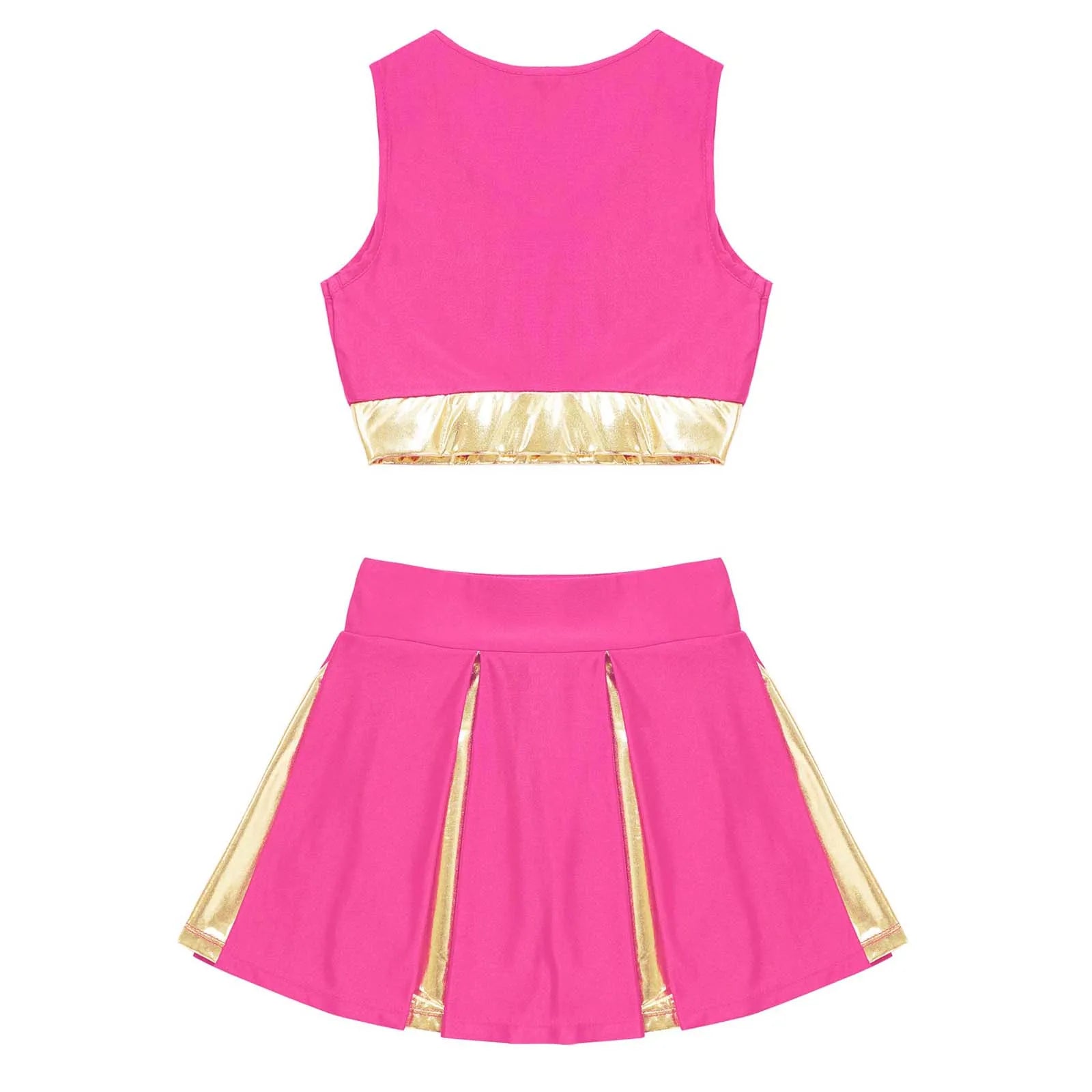Kids Girls Cheerleading Costume Cheerleader Uniform Sleeveless V Neckline Letter Print Crop Top with Elastic Waistband Skirt